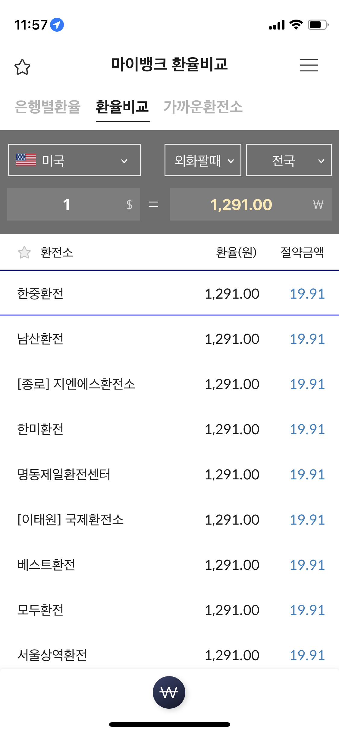 가장 저렴이 기준 달러당 1291원을 받을 수 있다고 나옵니다.